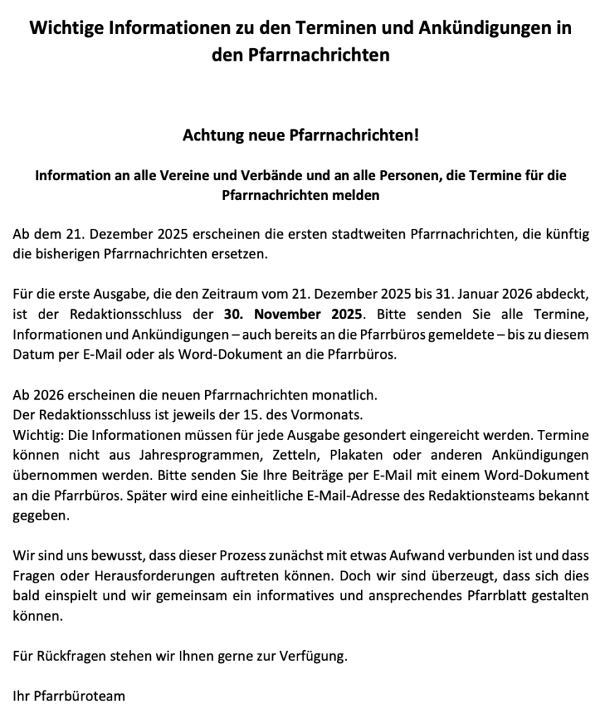 Am 8. und 9. November 2025 fanden die Wahlen zum Pfarrgemeinderat (PGR) und Kirchenvorstand (KV) und statt. Die Ergebnisse sind nachstehend aufgeführt. Wir danken allen Kandidatinnen und Kandidaten sehr herzlich dafür, dass sie bereit waren, sich in dieser Zeit des Umbruchs zur Wahl zu stellen. Ebenso gilt unser Dank allen, die im Wahlvorstand, im Wahlausschuss oder als Wahlhelferinnen und Wahlhelfer mitgewirkt haben. Durch Ihr Engagement wurde die Durchführung der Wahlen erst möglich. Allen gewählten Mitgliedern gratulieren wir und wünschen Gottes reichen Segen für die neue Aufgabe, Kraft für die bevorstehenden Herausforderungen und eine gute, vertrauensvolle Zusammenarbeit im Dienst der Pfarrei.